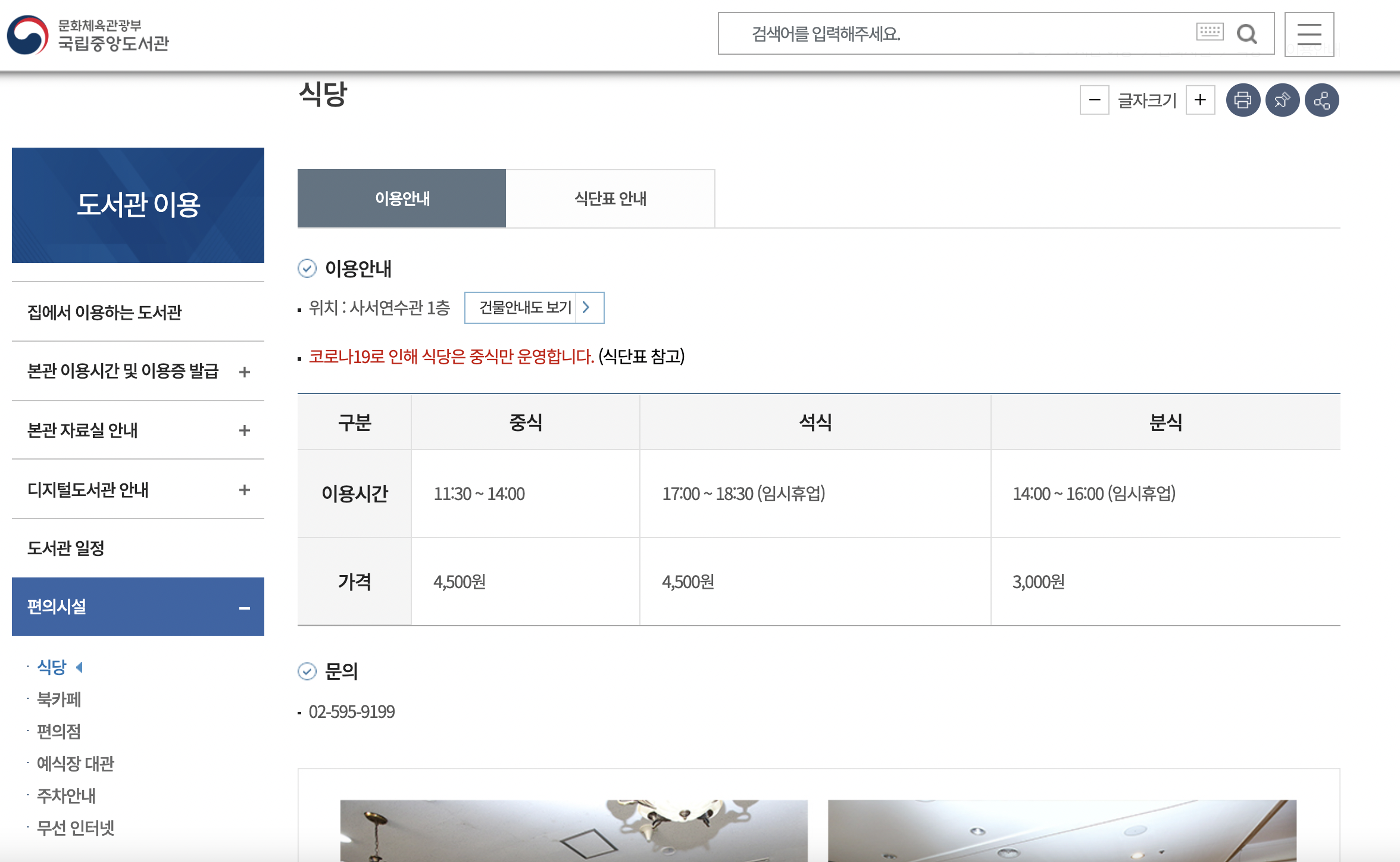 편의시설 메뉴에 들어가면 바로 '식당'메뉴가 나옵니다. 현재는 코로나19로 인해 중식만 운영이 되며 원래는 석식과 분식까지 같이 운영이 되고 있었습니다. 이용시간과 가격은 위의 표를 참고하시면 됩니다. 문의 전화번호는 02-595-9199입니다.