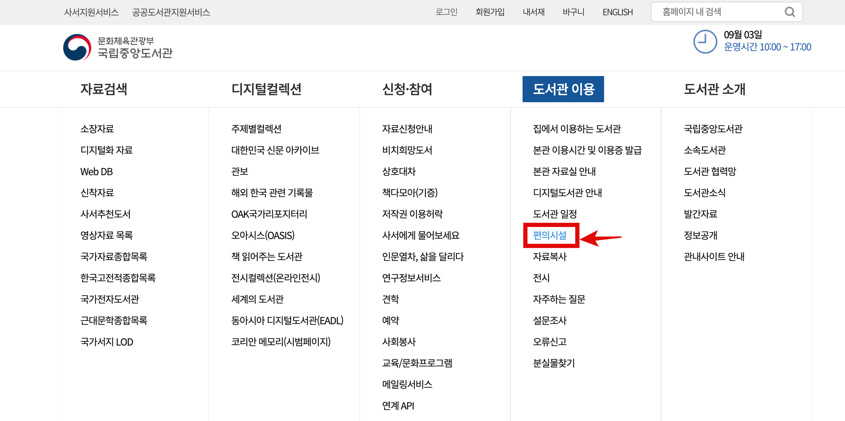 메뉴를 보시면 '도서관 이용'이라는 메뉴가 있는데 그곳의 서브메뉴인 '편의시설'에 들어가 주세요.