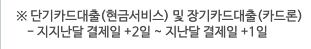 단기카드대출 (현금서비스) 및 장기카드대출 (카드론)은 지지난달 결제일 + 2일 ~ 지난달 결제일 +1일 입니다. 아래 표에서 확인해주세요.
