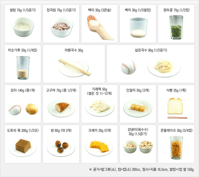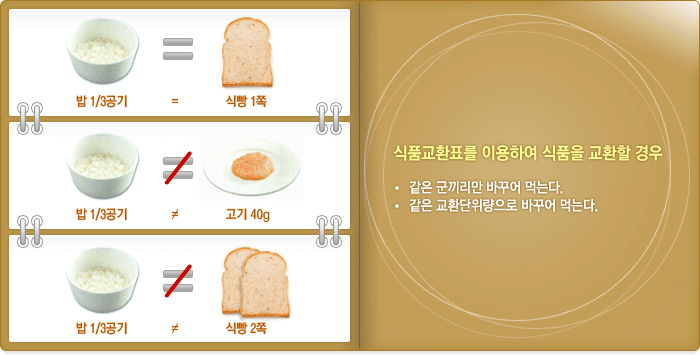 예를 들어 곡류군에 해당하는 밥과 식빵의 경우 밥 70g(1/3공기)과 식빵 35g(1쪽)은 1교환단위양으로 열량 및 영양소 함량이 비슷하며 같은 군에 속하기 때문에 서로 바꾸어 먹을 수 있다는 의미입니다.