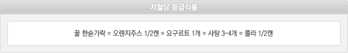 - 혈당이 70mg/dL 이하면 휴식을 취하며, 빨리 흡수되어 혈당을 올릴 수 있는 당질을 포함한 음식 (당류 15~20g)을 즉시 섭취합니다. 단, 너무 당황하여 증상이 사라질 때까지 음식을 계속 먹게 되면 고혈압이 될 수 있으므로 주의합니다.