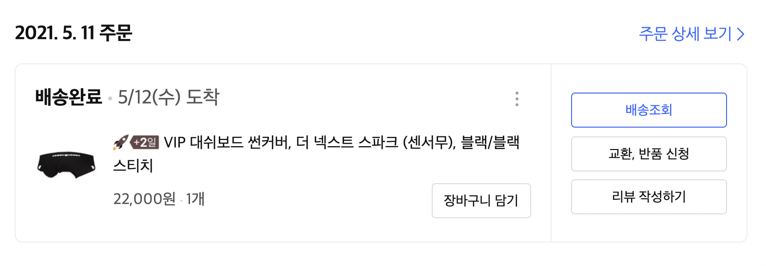 2021.5.11에 주문을 하였고 1일 뒤인 5월 12일에 배송이 완료되었습니다. 저는 전방센서가 없는 스파크를 타고 있어서 전방센서 자리가 없는 대시보드를 주문하였습니다.