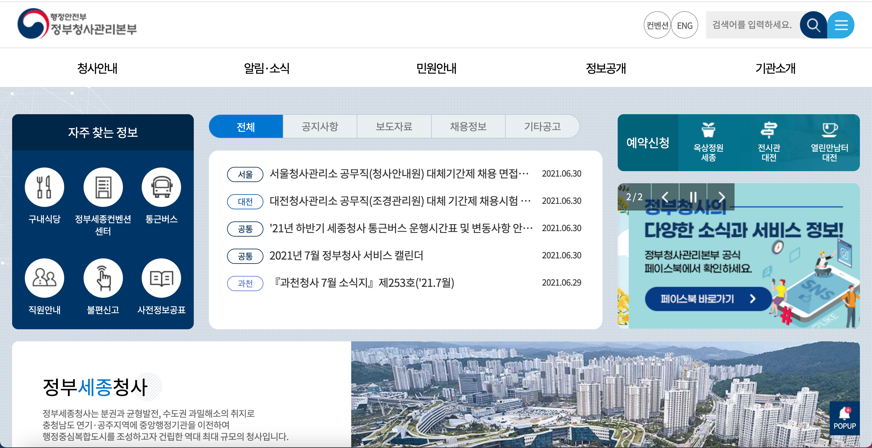 먼저 정부청사 홈페이지(https://gbmo.go.kr/chungsa/main.do)에 접속해주세요.