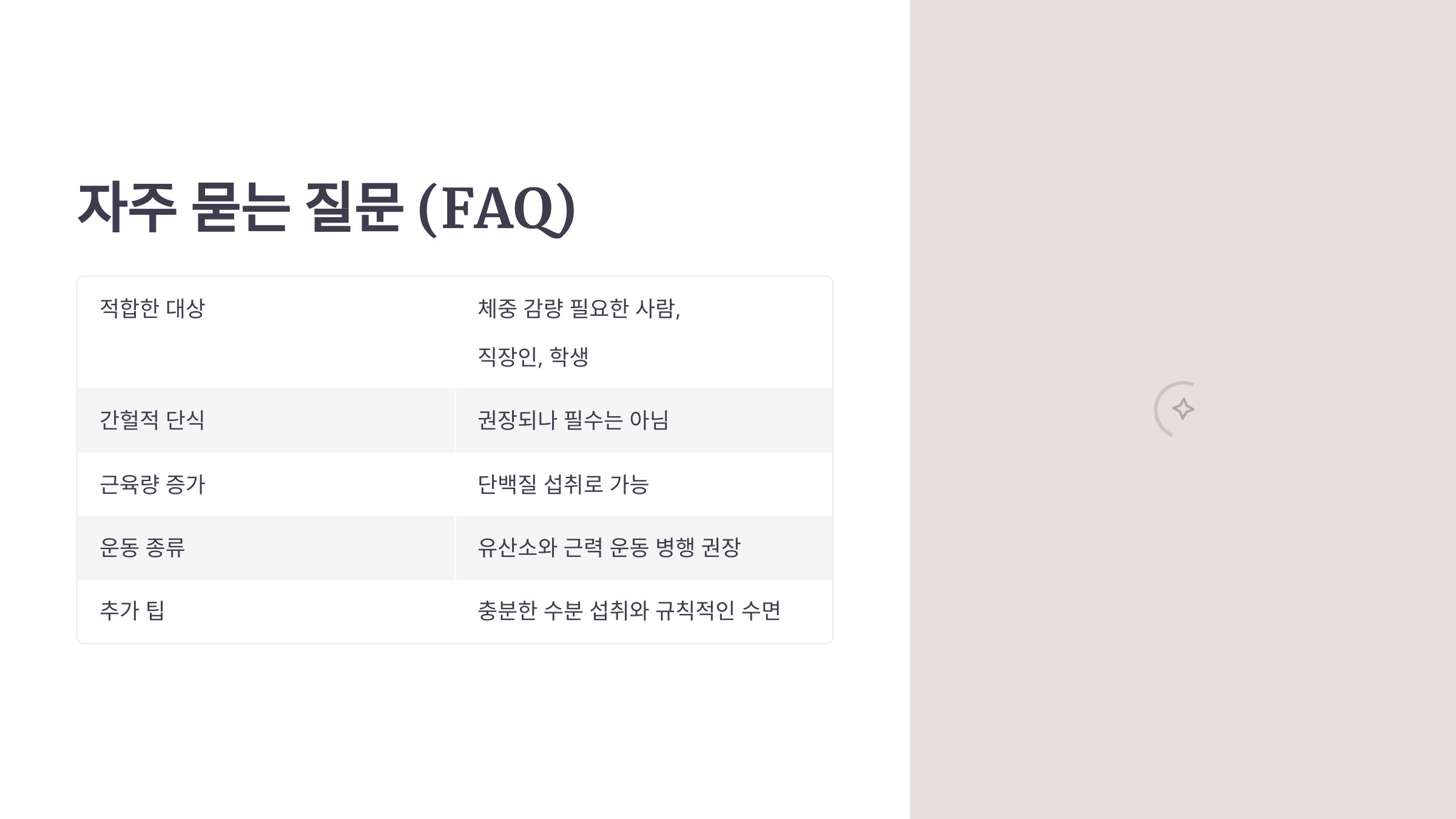 A1: 신진대사 촉진을 목표로 하는 다이어트로, 체중 감량이 필요한 사람에게 적합하며, 일상생활에서 쉽게 실천할 수 있어 직장인과 학생에게도 추천됩니다.