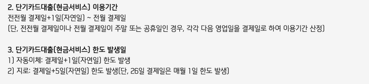 단기 카드대출(현금서비스) 한도 발생일은 두 가지가 있습니다. 첫째, 자동이체는 결제일 + 1일(자연일) 한도 발생이고 둘째, 지로는 결제일 +5일(자연일) 한도 발생 (단, 26일 결제일은 매월 1일 한도 발생)이라고 되어 있네요.