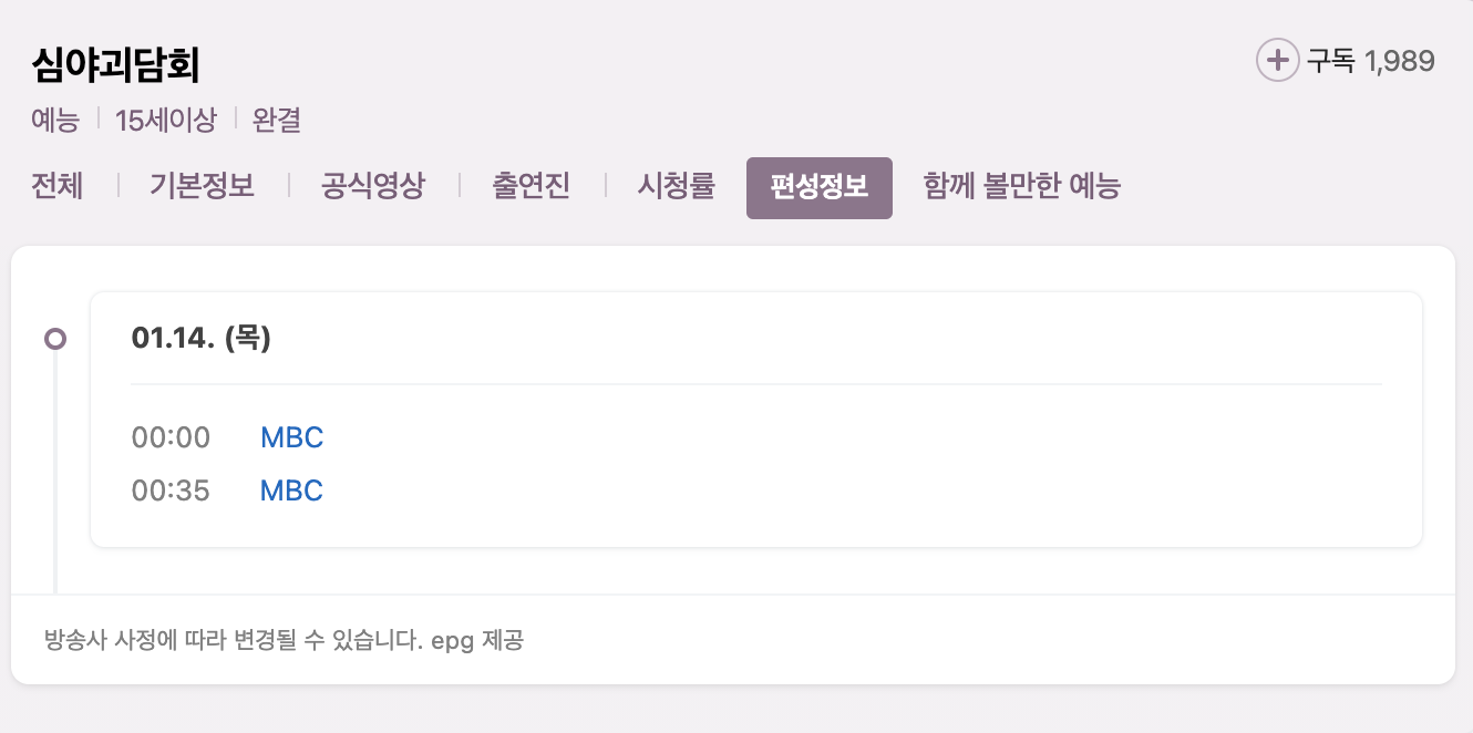 심야 괴담회의 재방송 다시 보기 시간표입니다. 1월 14일 목요일 00:00과 00:35에 시작하네요. 아래에 심야 괴담회 재방송 스케쥴 표를 링크걸어놓겠습니다. 원하시는 분들은 눌러보시면 그날 그날의 재방송 정보를 아실 수 있어요.