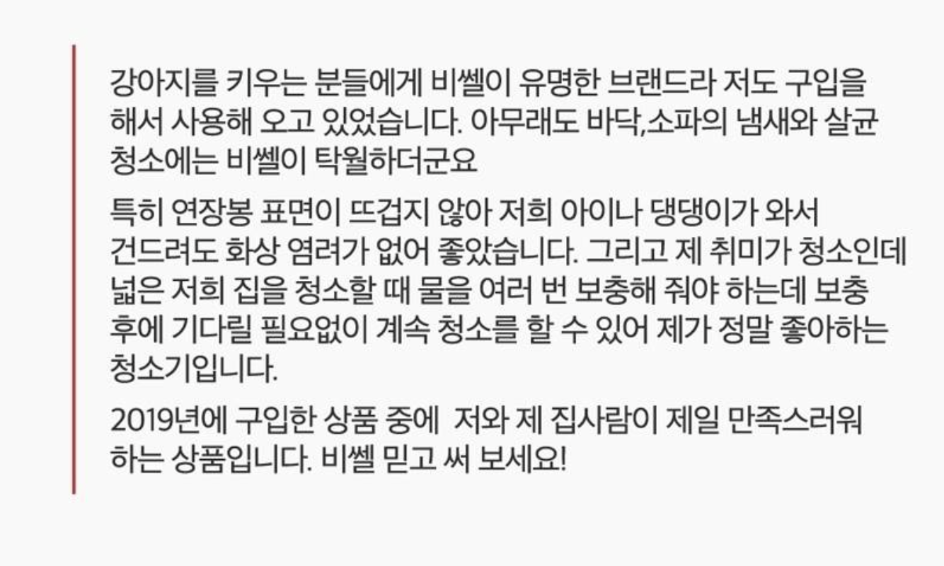 강형욱 "강아지를 키우는 분들에게 비쎌이 유명한 브랜드라 저도 구입을 해서 사용해 오고 있었습니다. 아무래도 바닥, 소파의 냄새와 살균 청소에는 비쏄이 탁월하더군요. 특히 연장봉 표면이 뜨겁지 않아 저희 아이나 댕댕이가 와서 건드려도 화상 염려가 없어 좋았습니다. 그리고 제 취미가 청소인데 넓은 저희 집을 청소할 때 물을 여러 번 보충해 줘야 하는데 보충 후에 기다릴 필요 없이 계속 청소를 할 수 있어 제가 정말 좋아하는 청소기입니다. 2019년에 구입한 상품 중에 저와 제 집사람이 제일 만족스러워하는 상품입니다. 비쎌 믿고 써 보세요!"