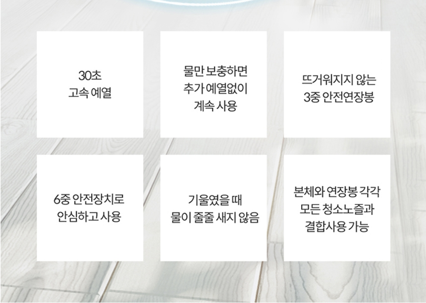다음은 비쎌 슬림 청소기의 특징입니다. 30초 고속 예열, 물만 보충하면 추가 예열없이 계속 사용 가능, 뜨거워지지 않는 3중 안전 연장봉, 6중 안전장치로 안심하고 사용 가능, 기울였을 때 물이 줄줄 새지 않음, 본체와 연장봉 각각 모든 청소 노즐과 결합 사용 가능합니다.
