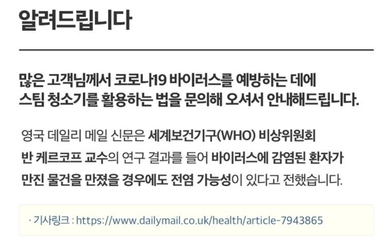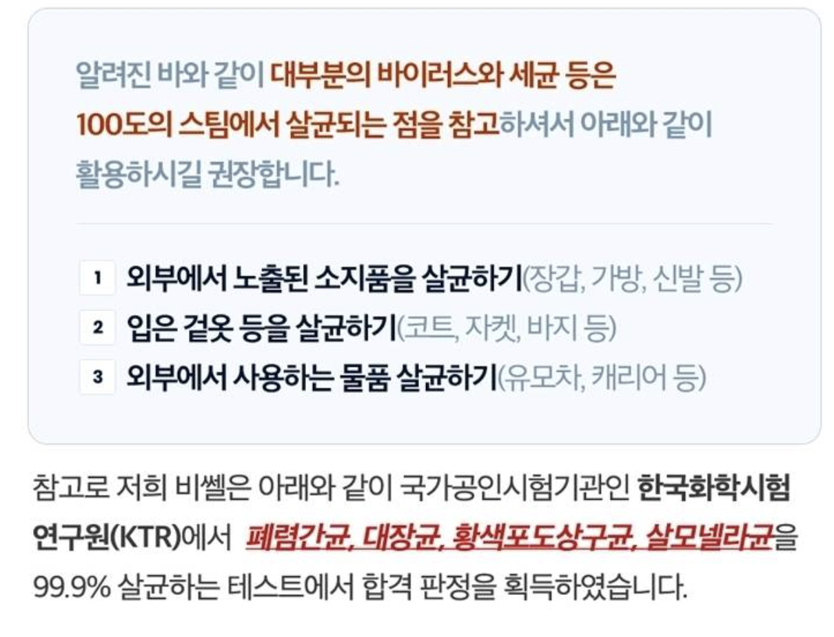 코로나 19 바이러스를 예방하는데에 스팀청소기가 탁월하다고 유명해진 제품 중 하나인데요. 위는 스팀청소기로 코로나 19 예방하는 방법입니다. 여러분들도 아시다시피 코로나 바이러스는 감염된 코로나 19 확진자가 만진 물건을 만졌을 때도 전염 가능성이 있습니다. 그래서 외부에서 사용한 소지품 살균이나 입은 옷 살균 등 스팀청소기는 여러 상황에서 살균할 때 사용하기에도 탁월합니다. 비쎌은 국가공인시험기관인 한국 화학시험 연구원에서 폐렴간균, 대장균, 황색 포도상구균, 살모넬라균을 99.9% 살균하는 테스트에서 합격 판정을 획득하였습니다.