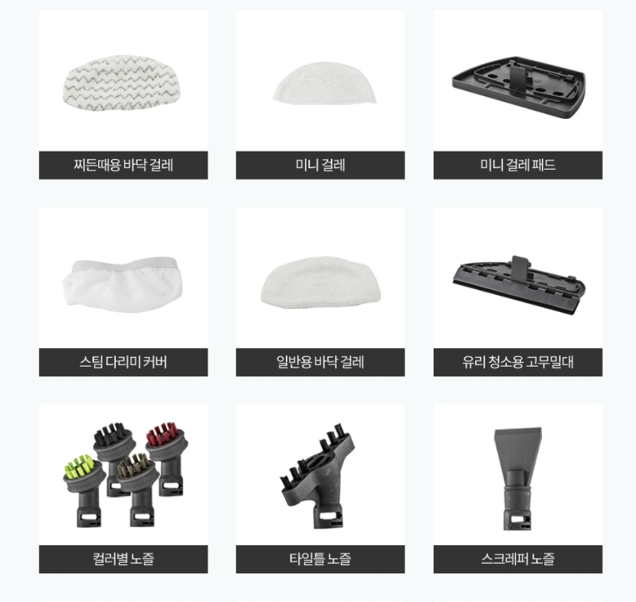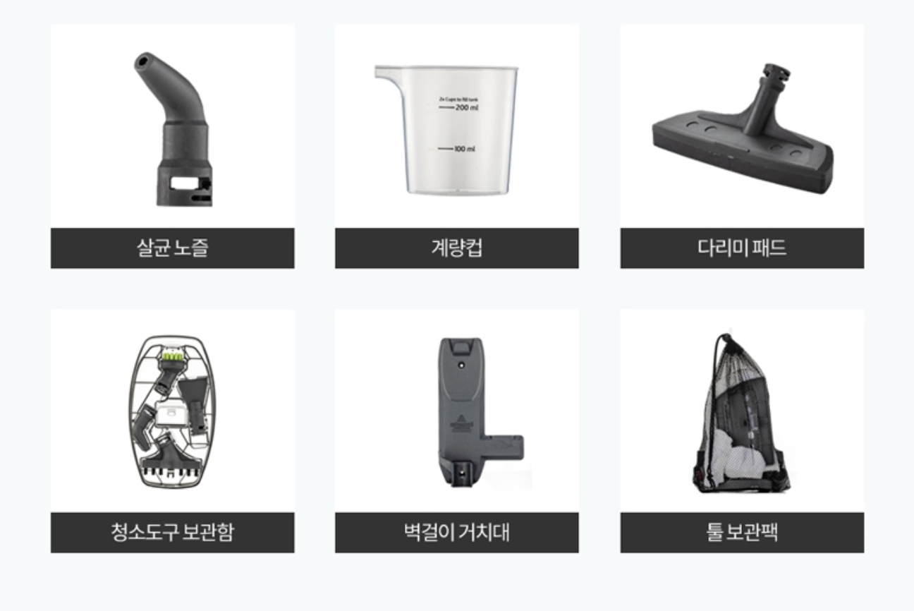비쏄 스팀청소기의 구성품 21가지입니다. 청소기 본체와 연장봉에 총 13종의 청소 액세서리가 들어 있어 각각 자유롭게 결합하여 집안 전체 구석구석 스팀 청소를 하기에도 편리합니다. 또한 350ml의 투명한 물탱크로 남은 물의 양을 청소 중에 계속 확인하기에도 편리하며 계량컵을 이용해 물 보충하기에도 좋습니다. 그리고 특수 3종 연장봉으로 온도의 손실 없이 뜨거운 스팀을 바닥까지 전달 가능합니다.