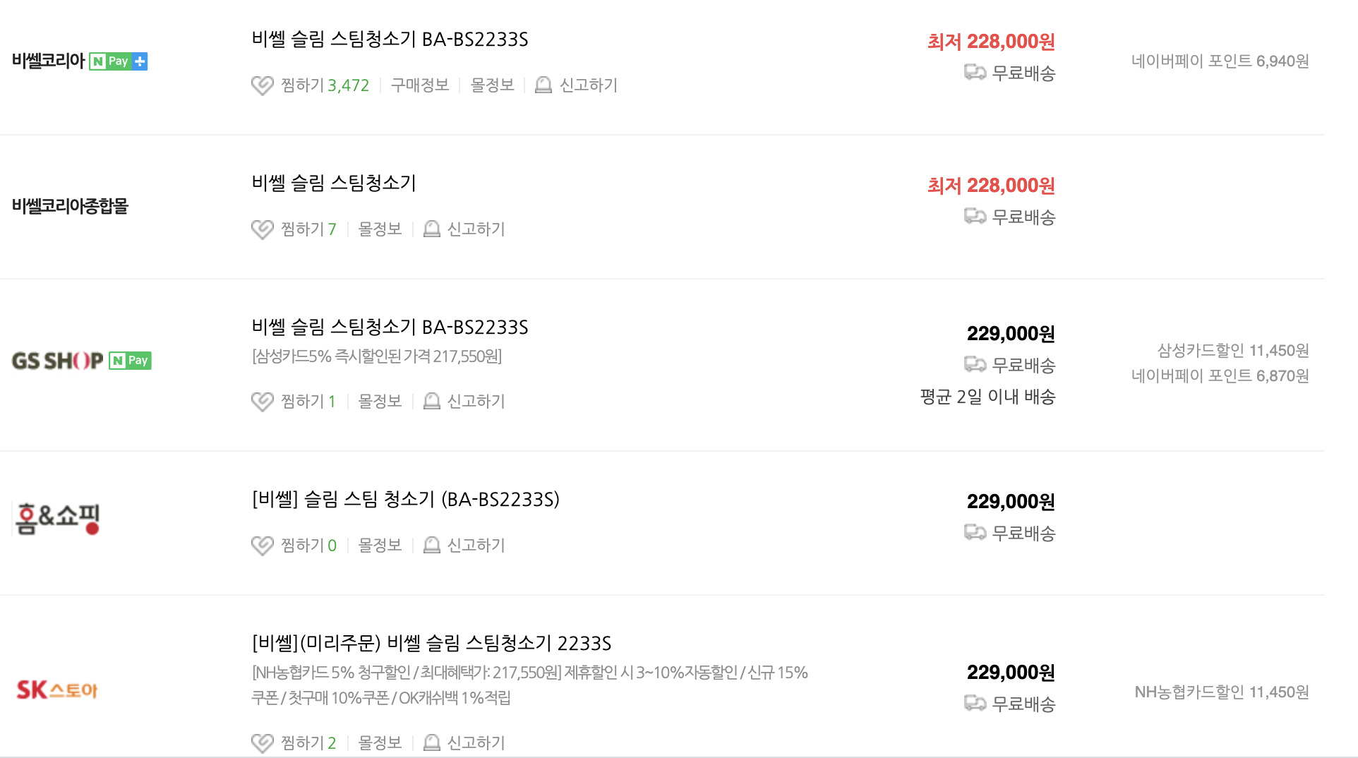 비쎌 슬림 스팀 청소기의 가격은 최저 220,000원 에서 230,000원 사이에 분포되어 있으며 구매하시는 사이트마다 같이 주는 사은품의 종류와 품질보증기간이 다르니까 잘 확인해보시고 구매해주세요.