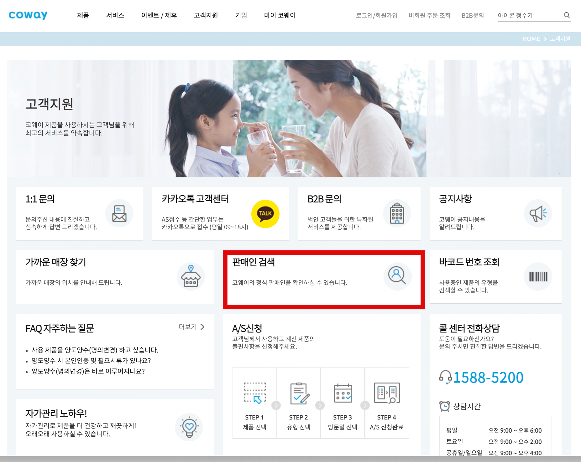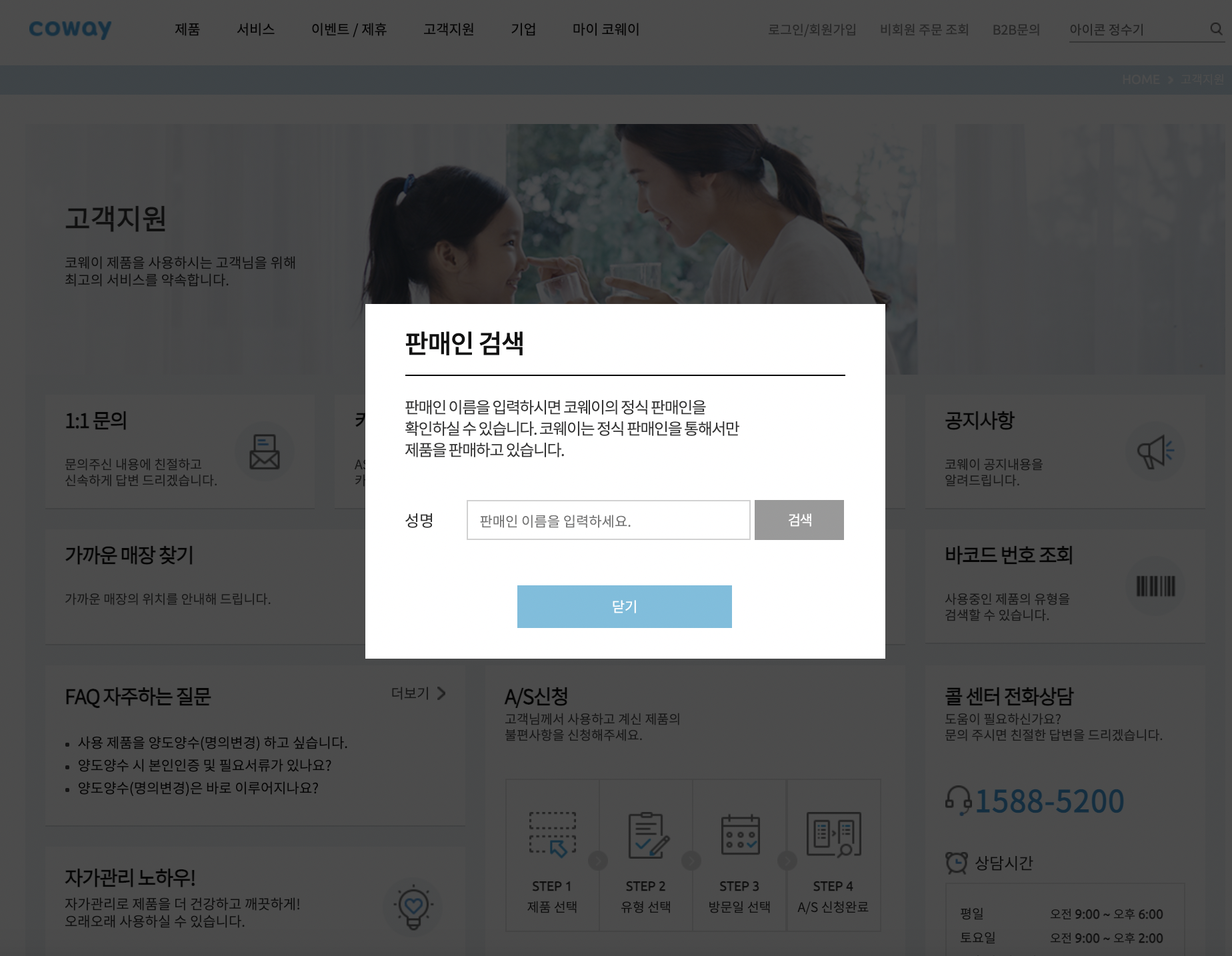 웅진 코웨이는 특이하게 정수기 판매인을 검색 할 수 있는 창이 있습니다. 보통 정수기를 처음 접하는 게 영업사원이나 주변 친인척들을 통해 많이 접하게 되는데요. 최소 3년에서 6년 정도 기기를 렌털 하는데 정식 판매원을 통해 구매를 해야 후에 A/S에 관한 사항에 문제가 없겠죠? 렌탈 전 정식판매원인지 검색해보시길 바랍니다.