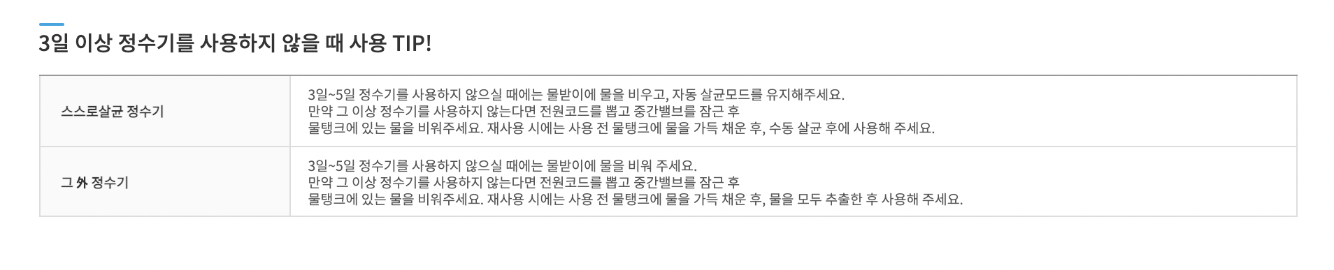 3일 이상 정수기를 사용하지 않을 때 사용 팁입니다. 3일 ~ 5일 정수기를 사용하지 않으실 때에는 물받이에 물을 비워주세요. 만약 그 이상 정수기를 사용하지 않는다면 전원코드를 뽑고 중간밸브를 잠근 후 물탱크에 있는 물을 비워주세요. 재사용 시에는 사용 전 물탱크에 물을 가득 채운 후, 수동 살균 후에 사용해 주세요. 스스로 살균 정수기는 위의 방법을 사용해 주시면서 자동 살균 모드를 유지해주세요.