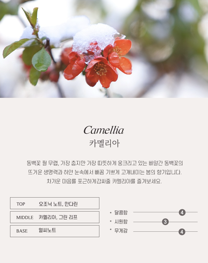 카멜리아는 동백꽃 필 무렵, 가장 춥지만 가장 따뜻하게 웅크리고 있는 빠알간 동백꽃의 뜨거운 생명력과 하얀 눈 속에서 빼꼼 기쁘게 고개 내미는 봄의 향기입니다. 차가운 마음을 포근하게 감싸줄 카멜리아를 즐겨보세요.