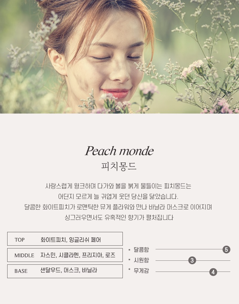 피치 몽드는 사랑스럽게 윙크하며 다가와 볼을 붉게 물들이는 피치몽드는 어딘지 모르게 늘 귀엽게 웃던 당신을 닮았습니다. 달콤한 화이트 피치가 로맨틱한 뮤게 플라워와 만나 바닐라 머스크로 이어지며 싱그러우면서도 유혹적인 향기가 펼쳐집니다.