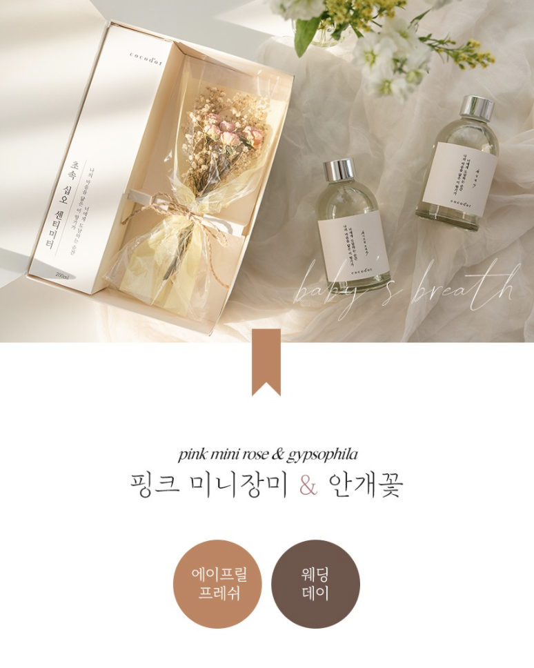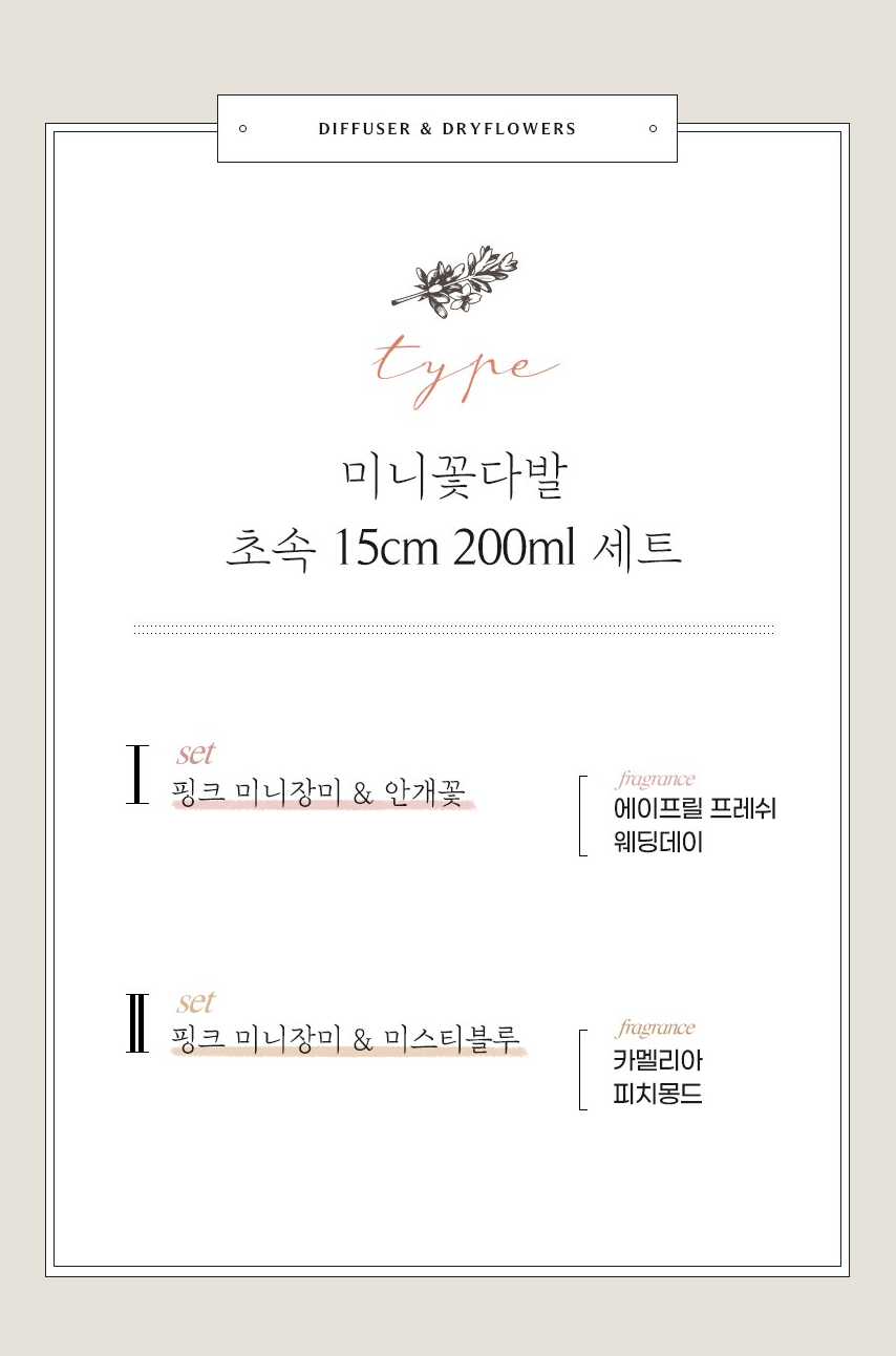 세트 1번은 핑크 미니장미 & 안개꽃 디퓨저 세트로 디퓨저는 에이프릴 프레쉬, 웨딩데이에서 선택 가능합니다.