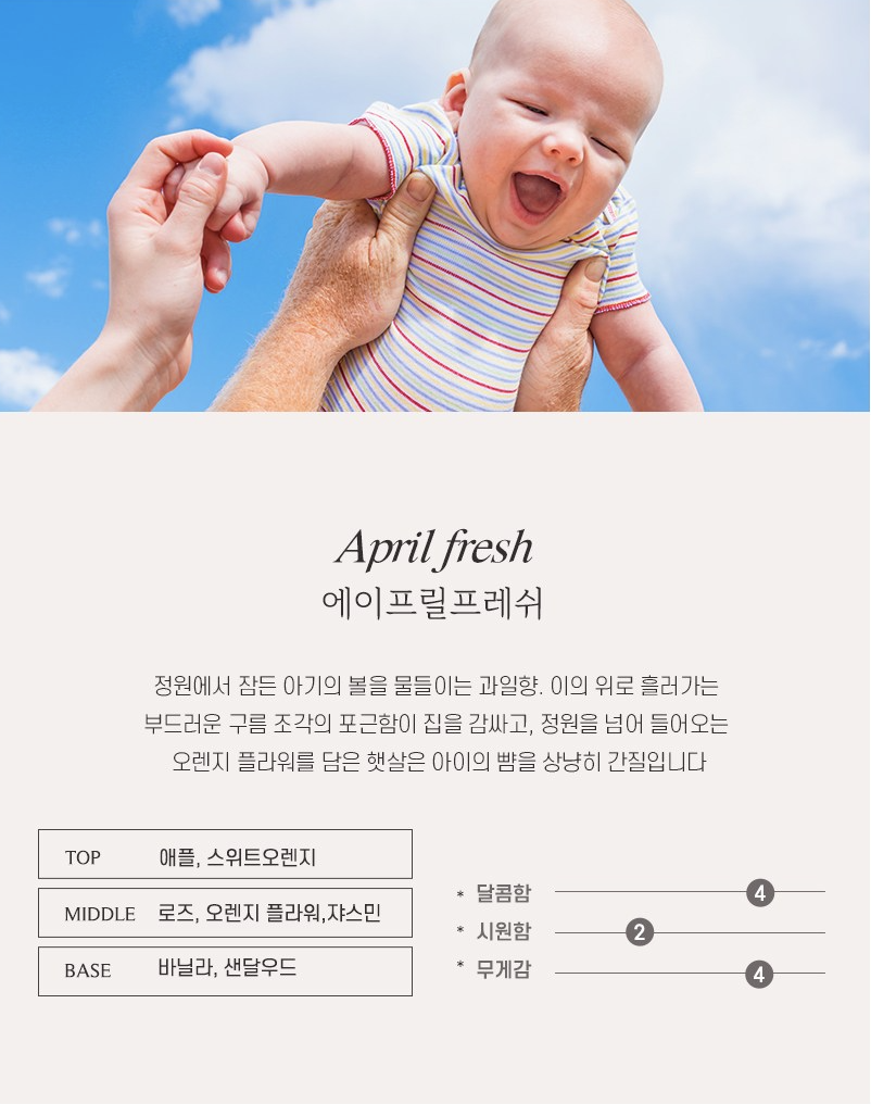 에이프릴 프레쉬는 정원에서 잠든 아기의 볼을 물들이는 과일향. 이의 위로 흘러가는 부드러운 구름 조각의 포근함이 집을 감싸고, 정원을 넘어 들어오는 오렌지 플라워를 담은 햇살은 아이의 뺨을 상냥히 간질입니다.