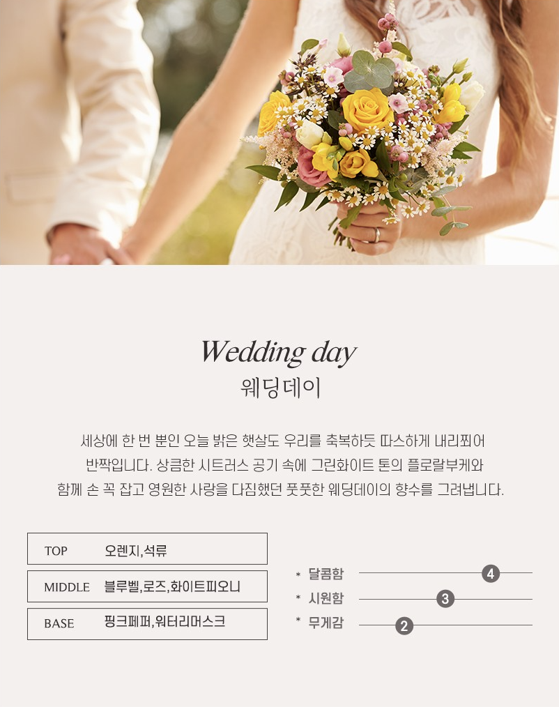 웨딩데이는 세상에 한 번 뿐인 오늘 밝은 햇살도 우리를 축복하듯 따스하게 내리쬐어 반짝입니다. 상큼한 시트러스 공기 속에 그린 화이트 톤의 플로랄 부케와 함께 손 꼭 잡고 영원한 사랑을 다짐했던 풋풋한 웨딩데이의 향수를 그려냅니다.