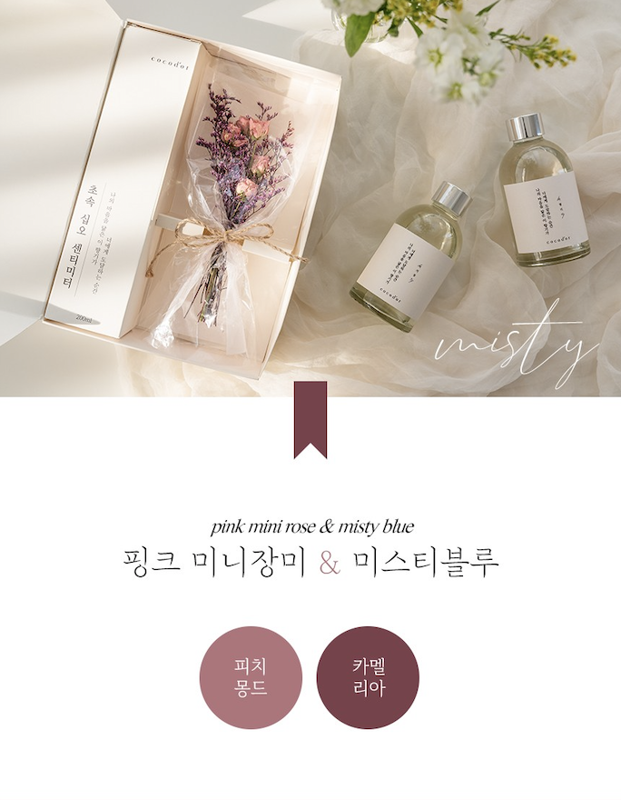 세트 2번은 핑크 미니장미 & 미스티 블루 디퓨저 세트로 디퓨저는 카멜리아, 피치 몽드에서 선택 가능합니다.