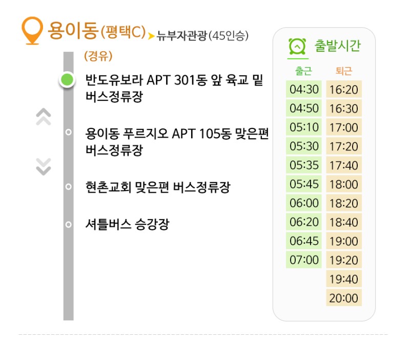 먼저 용이동 셔틀버스 노선도와 시간표입니다.