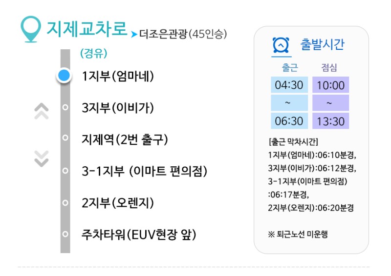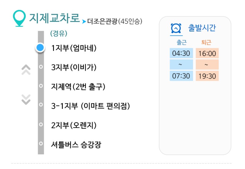 출발 시간과 퇴근 시간을 잘 보셔서 놓치지 않도록 해주세요.