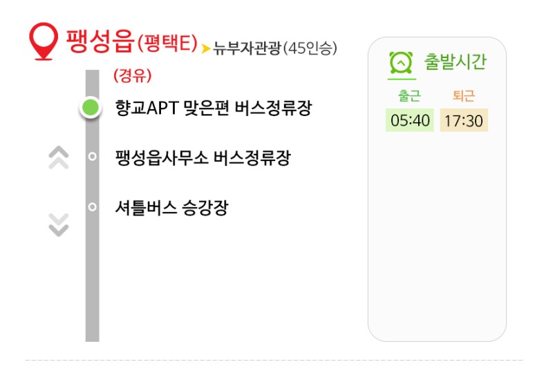 팽성읍을 지나가는 셔틀버스는 '향교 APT 맞은편 버스정류장'과 '팽성읍 사무소 버스정류장'을 경유하며 마지막으로 종점인 셔틀버스 승강장에 도착하는 노선입니다.