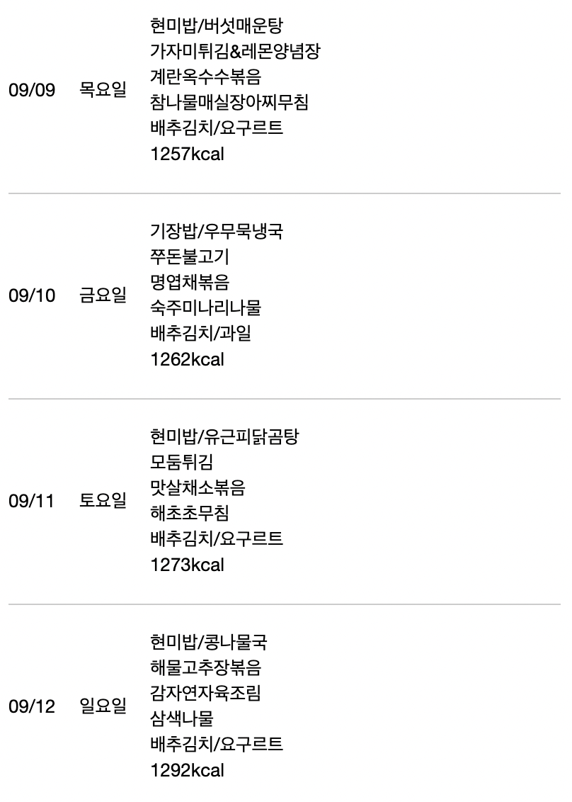 예시로 9월달의 본사에서 나오는 중식메뉴를 볼게요. 이렇게 2주의 식단표가 미리 나오며 후에 그 보름치 식단표가 나오는 시스템인거 같아요.