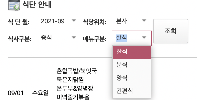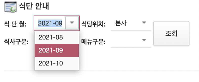 식단 월을 선택하는 메뉴입니다. 이전달과 이달 그리고 다음달 까지 총 3달의 식단표를 볼 수 있을거 같지만 10월달의 메뉴는 아직 작성이 되어 있지 않아요. 전달과 이번달까지의 식단표 밖에 알 수 없습니다.