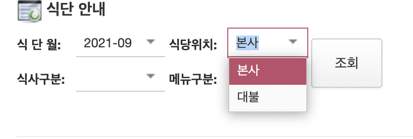 접속하시면 바로 식단안내에 대한 목록이 나옵니다. 식단표를 알고싶은 월과 식당위치, 식사구분, 메뉴구분을 선택해 조회를 해보세요.