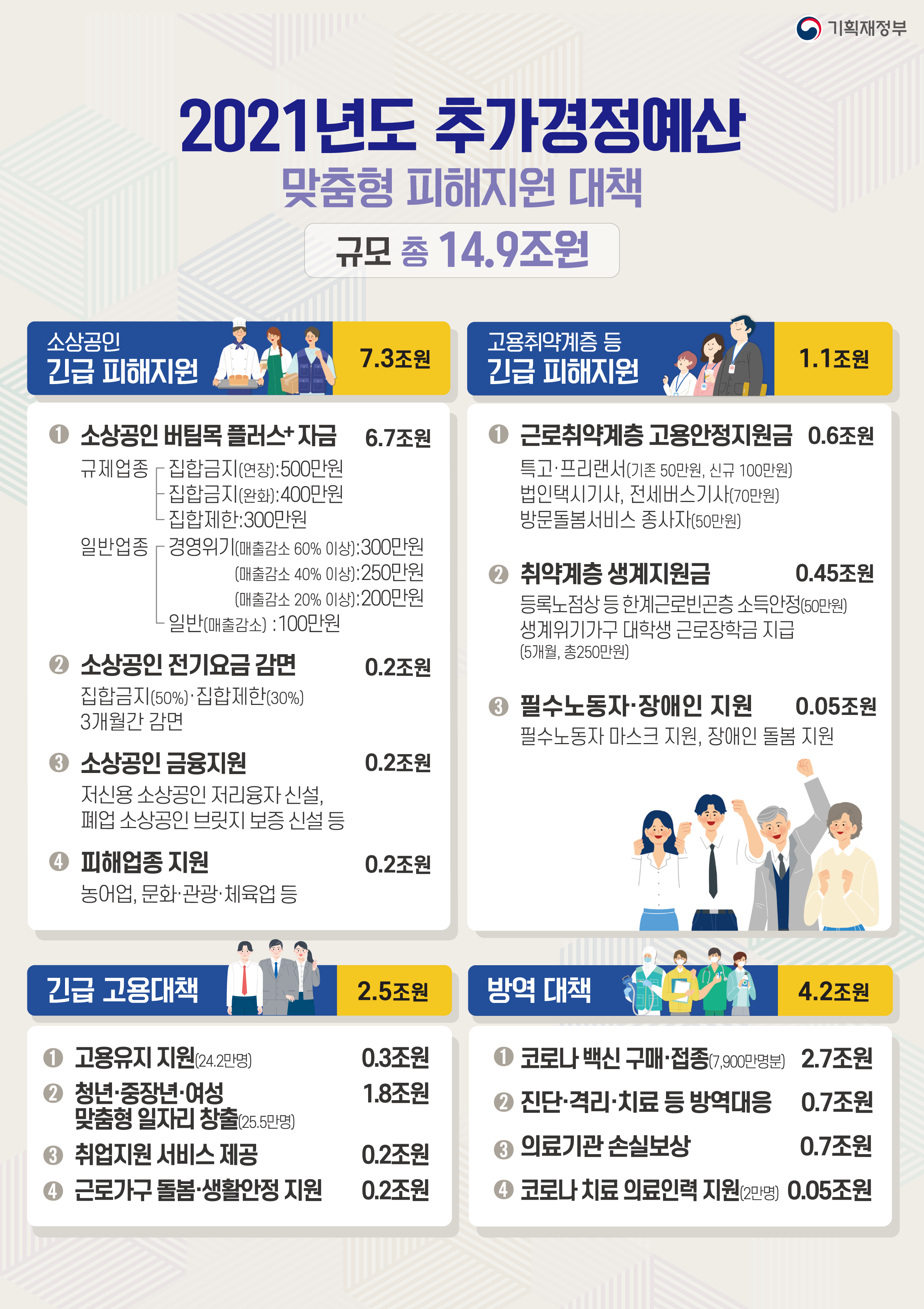 올해 기획재정부에서 2021년도 추가경정예산 맞춤형 피해지원 대책 규모를 총 14.9조 원으로 밝혔습니다. 소상공인 긴급지원, 고용 취약계층 긴급 피해지원, 긴급 고용대책, 방역 대책 등에 예산을 편성하였습니다.
